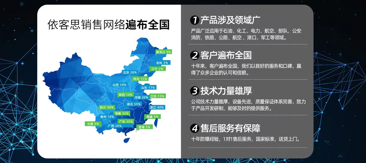 依客思防爆專注于防爆產(chǎn)品的研發(fā)、生產(chǎn)與銷售,主要產(chǎn)品有:防爆操作柱、BXCQ防爆靜電釋放儀、BZC系列防爆操作柱、不銹鋼現(xiàn)場操作箱、BXM(D)防爆照明(動力)配電箱、BXX防爆檢修箱、BXJ防爆接線箱、LED防爆燈、防爆管件、防爆風(fēng)機(jī)等產(chǎn)品,型號規(guī)格齊全,廣泛適用于煤炭、電力、醫(yī)藥、石油、化工、航空等領(lǐng)域。我公司產(chǎn)品質(zhì)量過硬,價(jià)格實(shí)惠,銷售范圍廣,且與各大型企業(yè)建立了良好的合作關(guān)系,同時(shí)還遠(yuǎn)銷中、東亞和北美等地區(qū),深受用戶喜愛與青睞。